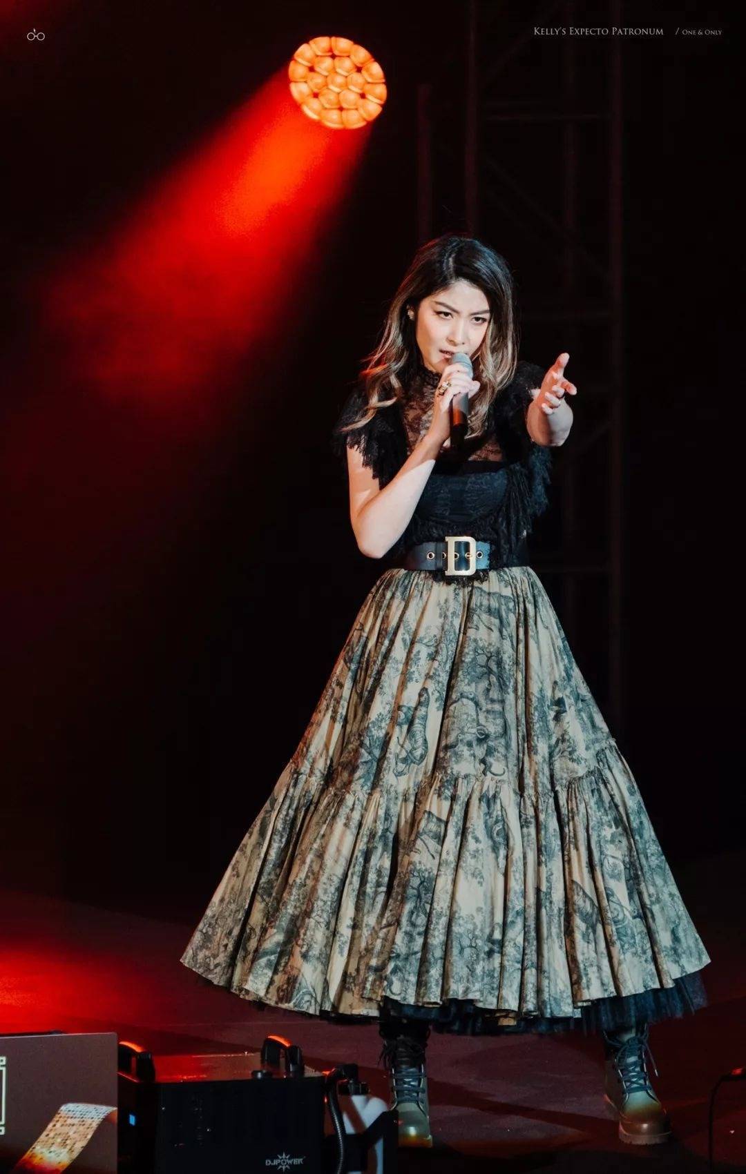印花半身裙的搭配看上去会更简洁,对于不擅长搭配的女孩子来说很友好,而陈慧琳这种半身裙宽松的裙摆帮助她修饰了身材,看上去特别有气场,黑色上衣的搭配也可以显瘦,并且和下半身的裙装形成对比。