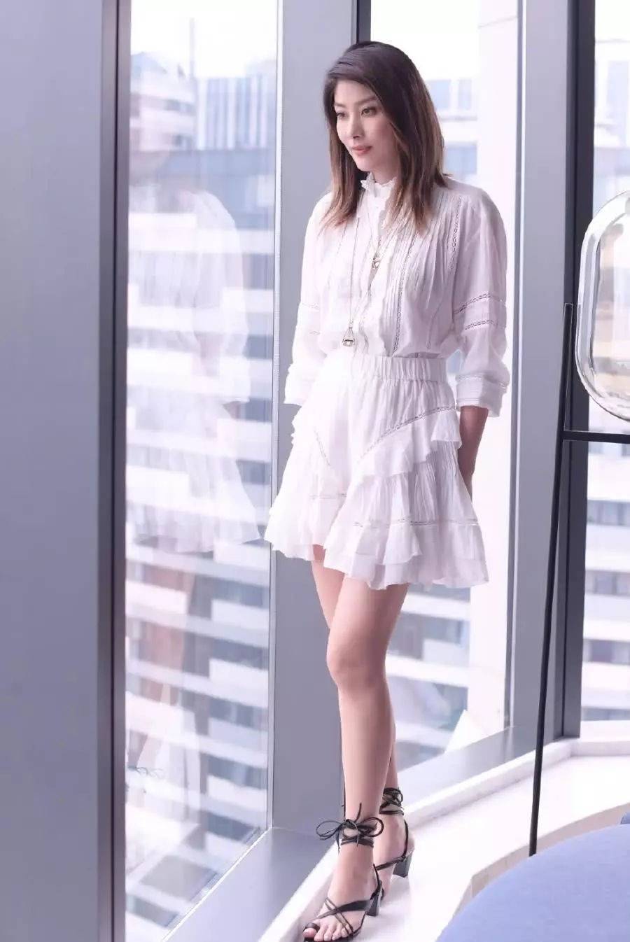 白色系的裙装搭配简约又随性,而且白色给人的感觉总是特别清纯,如果你想要减龄,那就一定要选择这种白色系的单品,陈慧琳这一身连衣裙融入收腰的处理,还能够秀出她的大长腿,看上去身材比例很不错。