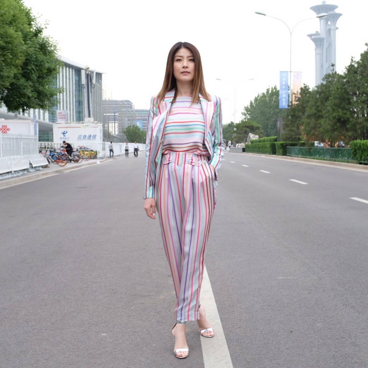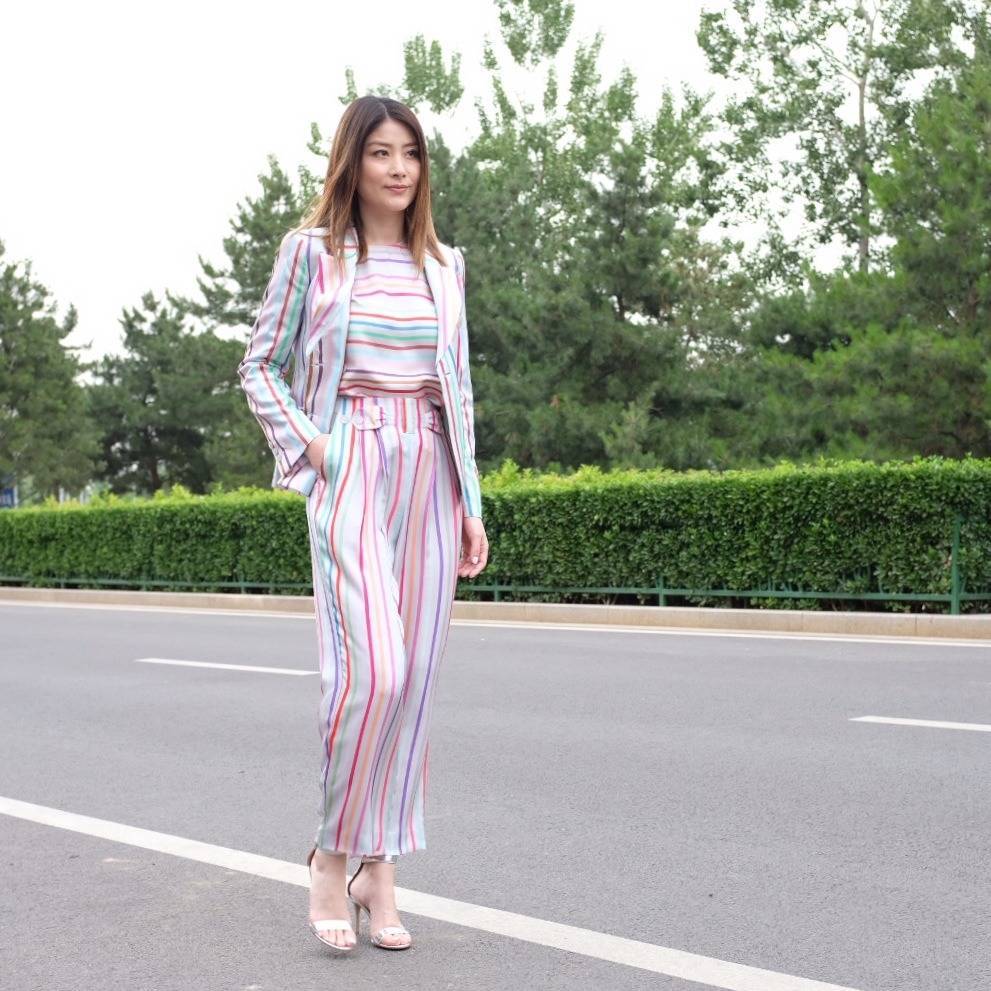 穿腻了普通的纯色西装,更推荐你们可以来尝试一下这种彩色的款式,而陈慧琳这身西装融入了彩虹色的条纹,看上去真的很浪漫。多种亮色系的碰撞,能够让她看上去更有活力,年轻感十足。